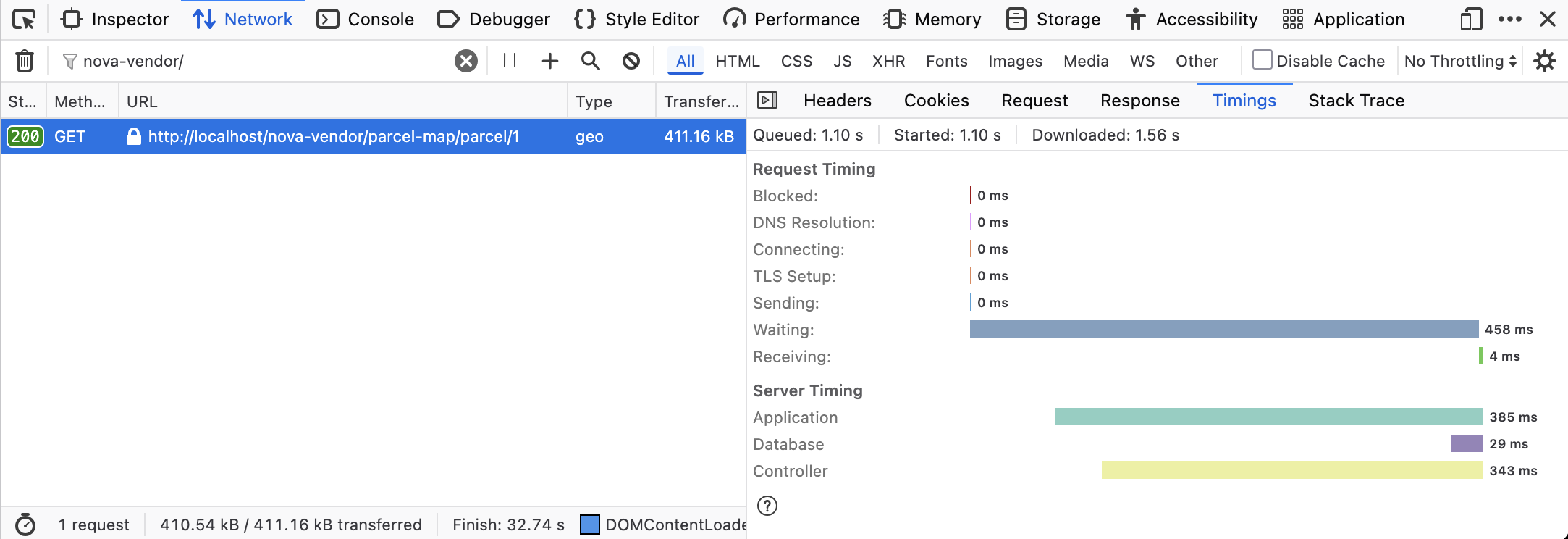 The majority of the time spent here is on the waiting. Nothing for the client do but wait. As soon as the server is done producing all that JSON it only takes 4ms to return it all, and the client then suddenly needs to start throwing all the pins onto the map all at once.