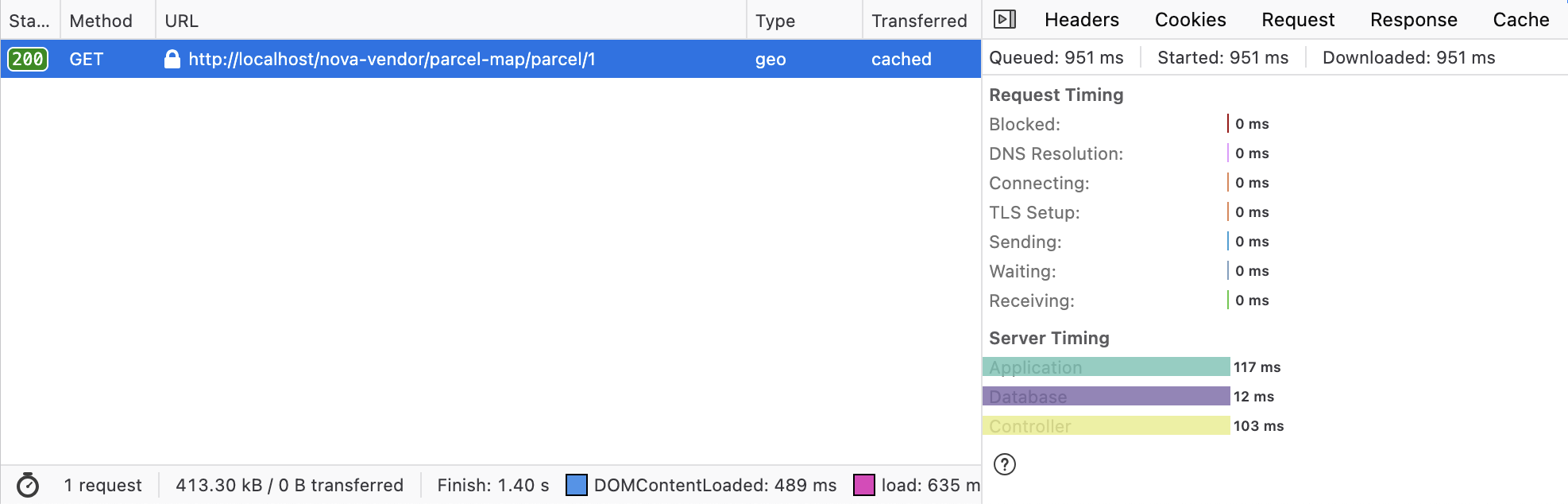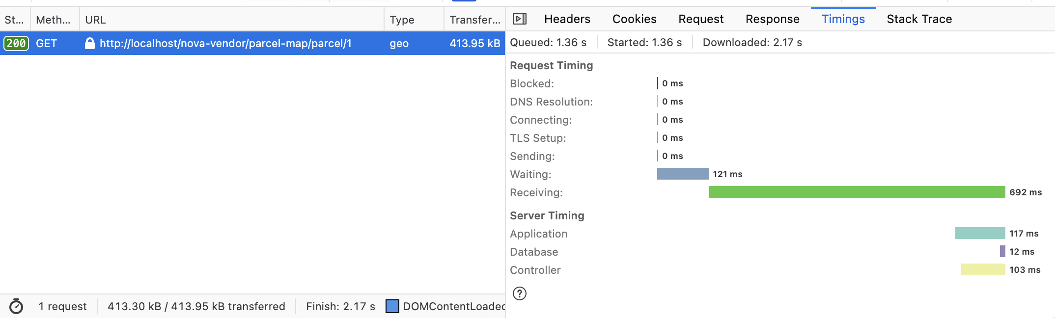 A /maps/parcel/abc endpoint outputs the GeoJSON, and for smaller sites this is fine. Those 20,000 sites struggle, first with zero pins showing up for almost 30 seconds, then the browser panics as it receives a huge payload and tries to render all of that at once.